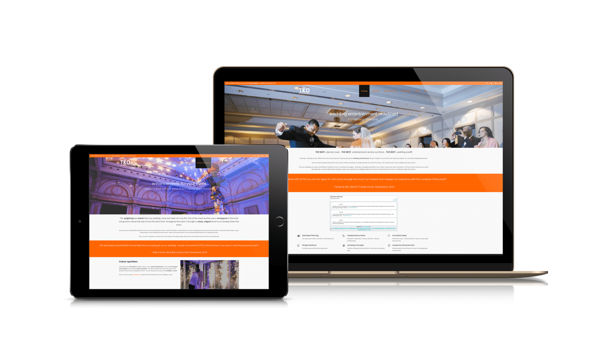 DJ TKO Entertainment needed a new website design and new marketing collateral to tell its story to sophisticated wedding couples and clients. At the same time, the site and literature were essential tools to support the company’s growing entertainment offerings. DJ TKO Entertainment, selected BeauMonde to create a cohesive brand and messaging strategy that communicated “Trustworthiness, dependability, innovation and professionalism.”